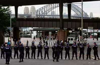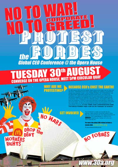Anti-globalization protests rock Sydneyreported The Sydney Morning Herald next day. See http://smh.com.au/news/national/protesters-stopped-from-bringing-down-the-house/2005/08/30/1125302566134.html