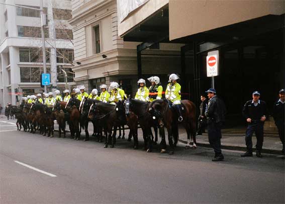 By the time we got to the Sydney Stock Exchange, there were police everywhere including the cavalry, 20 mounted officers lined up across street and all this for less than 20 ragtag protesters, a come and go swarm, persistent but with little coherence and coordination at the end of the day.