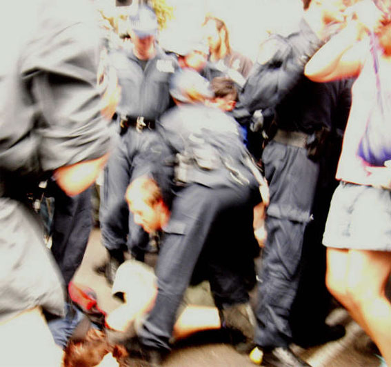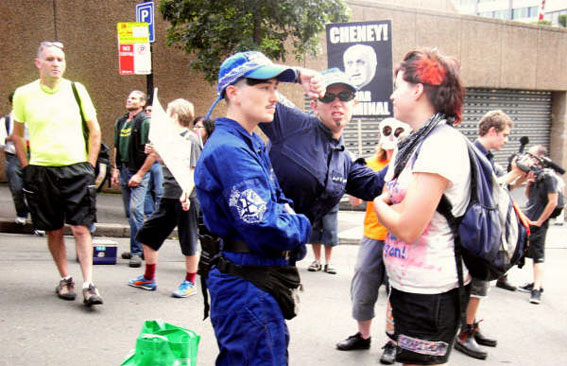 This is over 2 km away and was guaranteed to exhaust the participants on that hot day. Death march of a protest. An anti Cheney protest was thus transformed into an anti police protest and marched off to die.