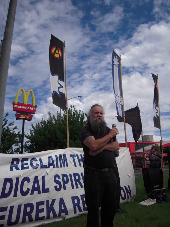 Here i found voice: "Eureka spirit is not to be found in the graves. It is not to be found in the blood. Being a child of Eureka, a direct descendant of a Stockader, means fuck all. Eureka spirit is to be found at the barricades and up against police lines, wherever the fight to defend rights and liberties is taking place."
