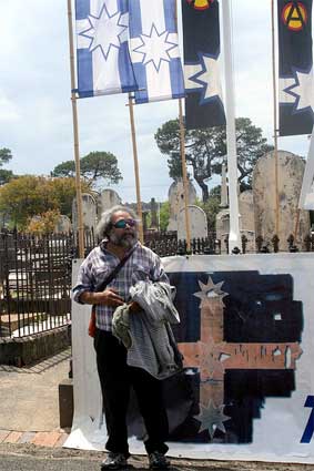 At the Cemetery i rigged the flags around the cast iron rail of the diggers grave and Dr Joe spoke again and Jacob Rumbiak expressing gratitude for being enlightened about the radical spirit of Eureka and expressing his solidarity. And we with him. What a hero; what a saint!