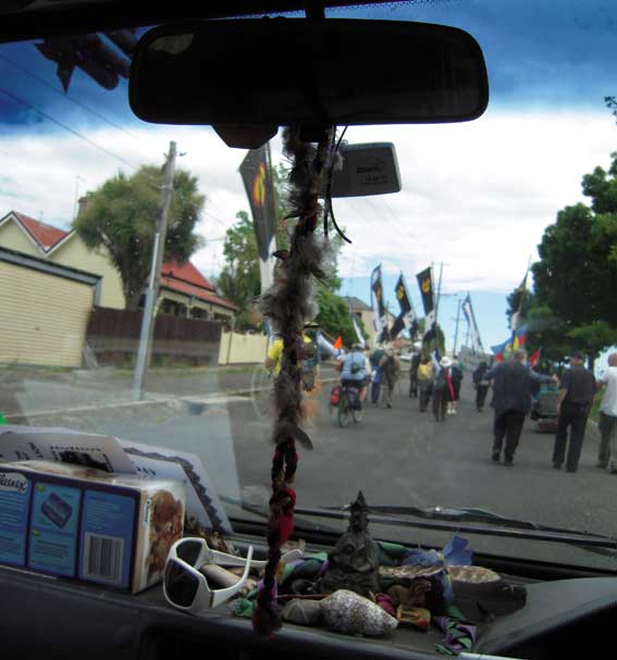 At 9.30 am we assembled for a march to the Bakery Hill, a parade of flags and banners and Peacebus.com bringing up the rear with PA. Long time anarchist activist Viola Wilkins joined me in the passenger seat and took the mike and sang Digger songs as we paraded down Sturt street.