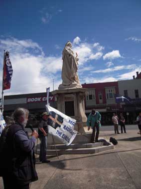 From Bakery Hill to Ballarat Town Hall where Mayor Julie Verlin with the assistance of the youngest Eureka marcher, 8 year old Tarryn, daughter of John aka Takver, hoisted the Eureka flag on a pole opposite the statue of Queen Victoria and under her marble nose and led by Dr Joe, we repeated the Eureka oath again.