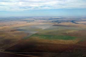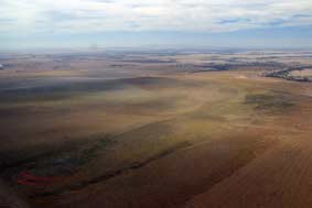 Lake Cowal is an ephemeral lake that fills when the Lachlan River floods. It has been dry for 10 years now but the green of the sedge grass can be seen. The Barrick's bunds (earth walls) can be seen extending out into the Lake bed.