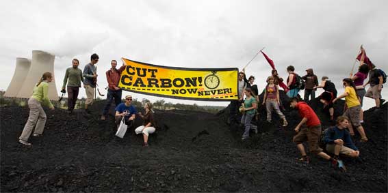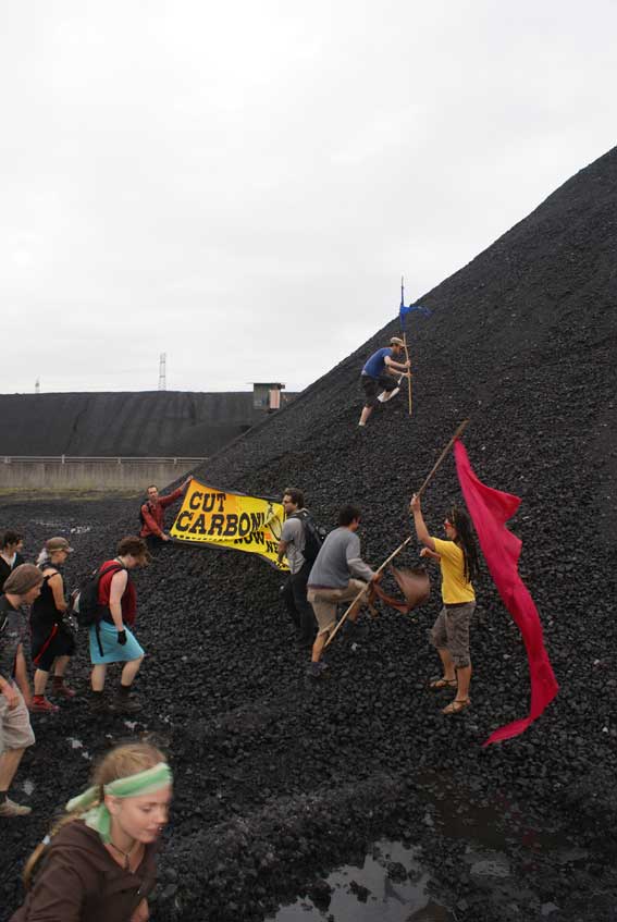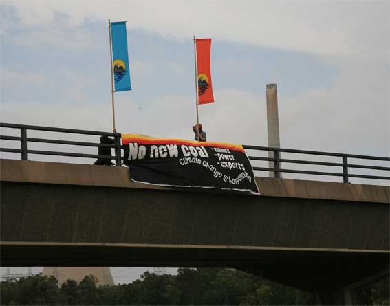 Protestors, from climate action group Rising Tide Newcastle, have stopped the conveyor belts that carry coal to Bayswater's furnaces in protest against the Federal Government's failure to stop Australia's greenhouse pollution rising. Others have blockaded the road into the facility and are occupying the stations coal stock-piles.