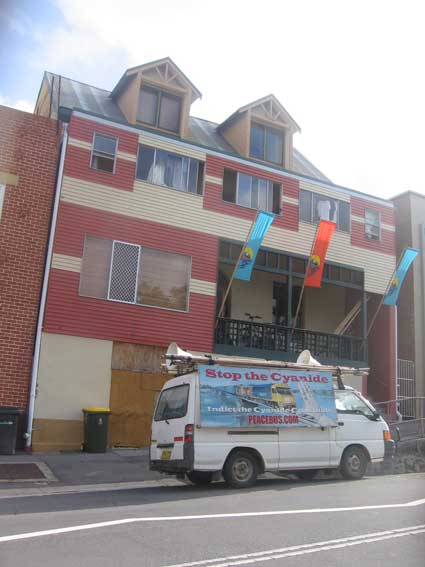Rising Tide conducts its business from an apartment within a shabby terrace in between the Cathedral and the surf beach in King Street, Newcastle. The office is called the Hunter Community Environment Centre (HCEC) and is a single room of clutter with posters of past actions on the wall piles paper, 5 work stations, one phone and a spaghetti of ethernet cables.