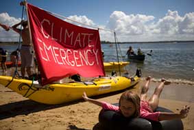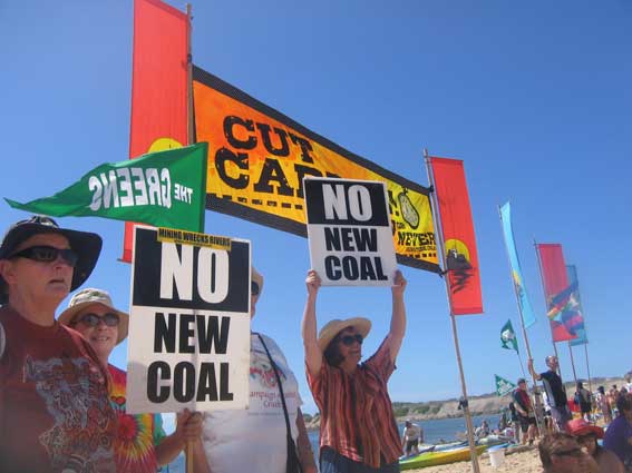 On Saturday 21 March, the 4th annual People's Blockade of Newcastle Harbour, biggest coal port in the world, transformed Horseshoe Beach into a blaze of colour with a mass of tall orange and sky-blue flags bright in the sun, the glorious flags of Benny Zable a-fluttering in the breeze, proud and beautiful banners rigged high ("Cut Carbon! Now or Never!" and "Stop Newcastle Coal Expansion") and a bright orange line of maybe two hundred kayaks drawn up at the water edge.