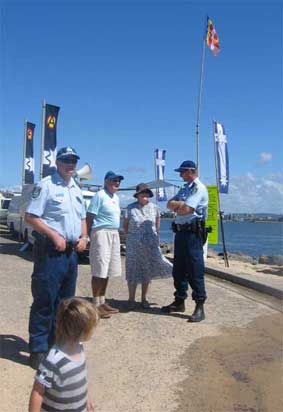 This day the police had two high speed zodiacs and no water skis. A 40 ft cabin cruiser was positioned across the channel between us and the coal loader. To all the world it looked as if it the cops were blockading the Harbour.