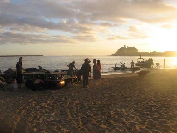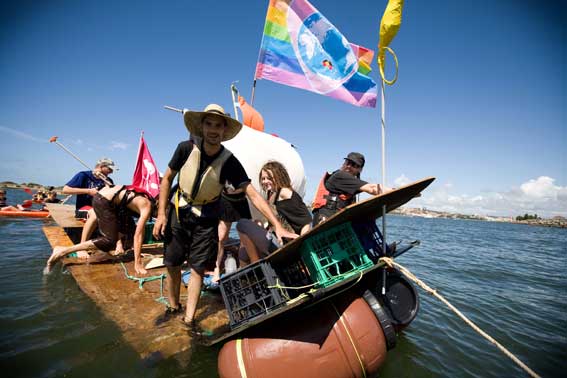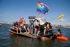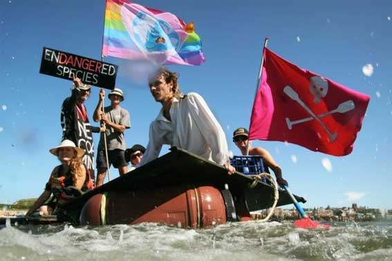 And there were costumes and floating artworks: a sinking Opera House (the immortal "No War" in red on its sail), a melting iceberg with plaintive polar bear, a bunch of worried penguins also with an iceberg and a three decked pirate ship improvised from milk crates, barrels and inner tubes lashed to plywood sheets.