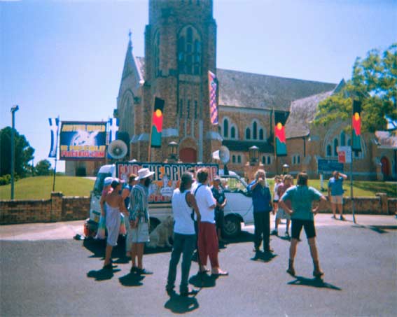 Fierce words spoken in public place, the speak-out at the Courthouse was something to behold. Across the road from the courthouse and under the steeple of the Lismore Anglican Cathedral, truth was spoken loudly on the Peacebus.com PA.