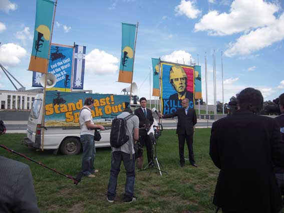 We never numbered more than ten (five Canberra folk had come drawn from postings on the Canberra anti war elist, some Socialist Alliance, others Quakers). But our occupation of the lawns of the Parliament, our timeliness, our art and our truth gave us a presence far greater and more far reaching than a body count would suggest.