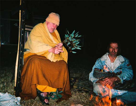 Some times the Dharma teaching was formal, Santi in a chair at the fire and we devotees sitting around cross legged on the ground; sometimes informal as in one to one conversations, questions and answers; sometimes it was formal ritual as in the blessing of the food offerings; sometimes it was inventively ritualistic with Santi invoking deities, near and far, seen and unseen, and leading us in geomancy.