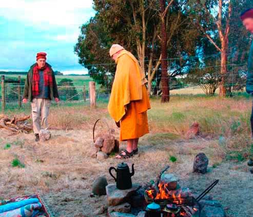 Willem and Graeme had rigged a 6 m by 7 m tarpaulin from the end of the former hatchery shed which, now renovated serves as a live in studio for Catherine, Willem and their babe, Maya Thiango. Expect for meals, the Retreat took place in the shade of the tarp by day and under the stars at night, Dharma teaching around a camp fire. Another bush Tarp Sala.