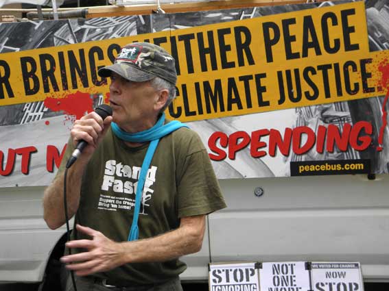 The Peacebus boomed out across Martin Place and i was at the mike, looking up at the anonymous tower that housed on its top floor the US Consulate. Nothing marked the offices of the Empire except a line of banners and behind them the cluster of cops and security preventing protesters entering its courtyard.