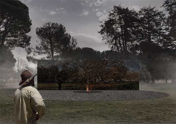 Designed by Daniel Boyd, a proud Kudjala/Gangalu/Kuku Yalanji/Waka Waka/Gubbi Gubbi/Wangerriburra/Bandjalung man from North Queensland, it comprises a fire pit in a circle of broken rock backed by a black glass wall about 3 m high by 8 m. The wall is covered with small circular mirrors.